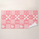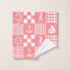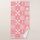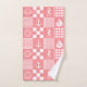 Conjunto cor-de-rosa de toalhas de banheiro com marcas e faixas geométricas, assim como cavalos marinhos, embarcações à vela, âncoras e rodas de navios.