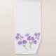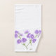 Este conjunto de toalhas de banho é mostrado em Branco com um adorável design de impressão de flores silvestres roxas. Personalize este item ou comprar conforme mostrado. Também disponível em um pano de lavagem separado, cortina de chá, travesseiros decorativos de poliéster, porta-escovas de dentes e conjunto de dispensador de sabão. Imagem do stock