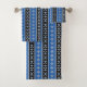 Toalha de banheiro preto e azul com faixas e diamantes.
