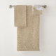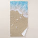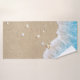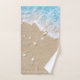 Lindas ondas de praia azuis rolando em areia macia de praia coberta em bonito conchas decoram esse conjunto de toalhas.