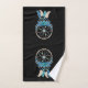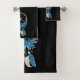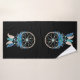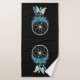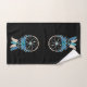 Toalha com uma coletora de sondas bonito. Cor azul, turquesa e creme. Decorados com penas, miçangas e flores. Fundo preto.