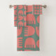 Este conjunto de toalhas tem um design de Boho de flores de coral se repetindo através do design num campo de verde.