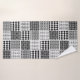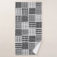 Esta toalha pôs um pano de lavagem branco, uma toalha preta, e uma toalha de banho que tem um design Boho de quadrados com padrões em preto e branco.
