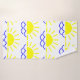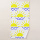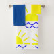 Este conjunto de toalhas tem uma toalha de banho com um design Boho de meio círculo com linhas para fazer um sol e vieiras para fazer água, um pano de lavagem amarelo e uma toalha azul de mão.