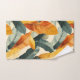 This bathroom towel set features a lush tropical boho pattern of banana palm leaves in rich autumn earth tones of green, gold and rust.