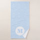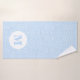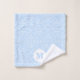 Um azul claro e macio com padrão botânico branco e seu monograma em um círculo branco.