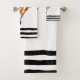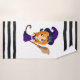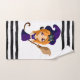 Uma toalha de banho com uma bruxa fofa vestindo um chapéu de bruxas roxas. Seu gato preto descansando em cima da cabeça. Ela tem cabelo laranja longo e é carregando vassoura. Ótima ilustração de desenho animado perfeita para halloween.