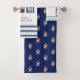 Tema costeiro azul, branco, cor vermelha, conjunto de toalhas de Bath artsy, com ilustração de aquarela de cabanas de praia, listras, texto personalizado, projetado por TheLakeIsland.