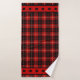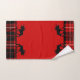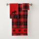 Toalha de banho armada com uma cabana na design com uma xadrez vermelha, preta e creme, alce e impressões de cascos.