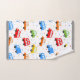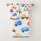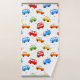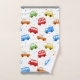 Uma toalha de banheiro bonita para um banheiro para garotos pequenos. Cores primárias de carros, caminhões e outros veículos, tudo que os meninos adoram. A trim é um piso de pneu falso. Adorável. Comece este tema no banheiro, no berçário e o carregar para o quarto de meninos.