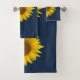 Toalha de Verão de Girassóis Amarelos colocada sobre fundo azul marinho. Uma adição floral de campo à decoração do banheiro!