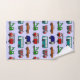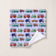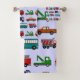 Este conjunto de toalhas tem um design de caminhões e ônibus novidade em vermelho, azul, verde e marrom em um campo de azul claro.