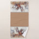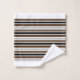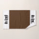 Toalha de banheiro com tema de cavalos, com toalha de banho feita em bronzeado com gráficos aquosos de cavalos selvagens correndo, em ambas as extremidades da toalha. A toalha da mão é feita em castanho, com bordas brancas e texto preto personalizado lendo nudez. O pano de lavagem é feito em tiras de branco, cinza, castanho e castanho.