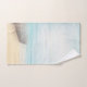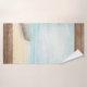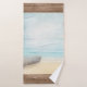 Toalha com uma bela imagem rústica. Cores sutis de azul claro, marrom arenoso e branco suave. Uma cena de praia com um barco na praia com uma rede de pesca pendurada ao lado. Um olhar elegante.