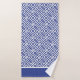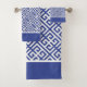 As toalhas de padrão grego azul e branco com detalhes de faixa. Cortina de chá de coordenação e tapete de banho disponíveis.
