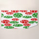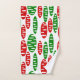 Este conjunto de toalhas tem um padrão repetitivo de ovais em vermelho e verde com ovais brancos espalhados em um campo de branco.