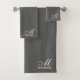 Um elegante e simples roteiro branco, inicial com pestanas, e seu nome embaixo, monograma em um conjunto de toalhas de cinza. Simples elegância. Para ele ou para ela.