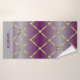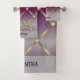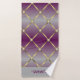 Um conjunto de toalhas geométricas de malha dourada moderna feminina que fará seu banheiro parecer elegante. Uma malha dourada contra um fundo de gradiente roxo e cinza. Edite o nome.