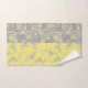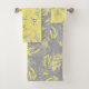 Conjunto De Toalhas Cinzas e folhas amarelas sobre fundo listrado.