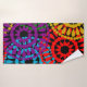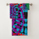 Este conjunto de toalhas tem um design de História Negra de grandes círculos formados por formas de chuva e círculos em vermelho, amarelo, roxo, verde e turquesa.