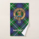 Crachá da crista Clan Forbes rodeado por uma correia e fivela sobre fundo tartano. Texto personalizado em cada toalha.
