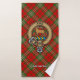 Crachá da crista Clan Scott rodeado por uma correia e fivela sobre fundo vermelho-tartano. Texto personalizado em cada toalha.