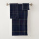 Navy blue tartan plaid bath towel set. Featuring a classic crisscross of deep navy and subtle gold accents, this sheet evokes cozy winter nights and fireside traditions. The rich palette and tailored pattern bring a refined, preppy touch to holiday decor.