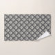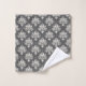A towel set and washcloth feature a classic white floral damask pattern on a dark gray background. The bathroom accessories convey a sophisticated and elegant tone.