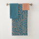Este conjunto de toalhas tem um pano de lavagem rosa, uma toalha de mão teal, e uma toalha de banho com um design moderno do século médio de linhas ziguezaguis a rosa e um fundo em brasa. Se você quiser o mesmo design com cores diferentes, me mande uma mensagem.