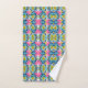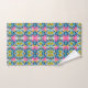 Um conjunto de toalhas coloridas com padrões geométricos vibrantes em azul, rosa, amarelo e verde pendurado em uma haste. Uma toalha de rosto combinando é dobrada abaixo.