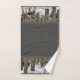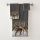 Uma toalha de banho rústica ajustada aperfeiçoa para uma cabine nas madeiras ou na outra decoração do país. As toalhas do banho e de mão caracterizam uma imagem que eu tomei de cervos da cauda branca nas madeiras logo após uma neve nova em um fundo escuro com cones do pinho. O washcloth de coordenação é o mesmo fundo escuro com cones do pinho e moldado com um teste padrão de harmonização do diamante