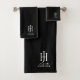 Uma toalha de banheiro moderna, com um elegante monograma branco sobre fundo preto que expele uma estética luxuosa e sofisticada. O cenário preto do monograma cria um impressionante contraste visual, enfatizando o luxo subestimado e o refinamento do design geral. Adicione este estilo à decoração do banheiro para uma vibração mínima moderna. As iniciais combinadas criam um efeito design elegante.