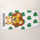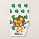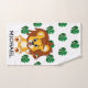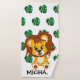 Este leão giro está sentado esperando para tocar. Atrás dele está um fundo branco com um padrão de folhas da selva. Debaixo dele está o nome do seu filho, que está brincando na floresta tropical com ele. Adicione um amigo bonitinho à hora de banho do seu filho!