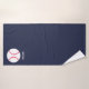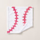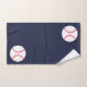 Crianças Personalizadas Do Baseball Esportivo Blue Athletic Bathroom Set. Personalizado em letra branca curvada em toalha de corpo acima de uma bola de basebol branca com costura vermelha. A toalha de mão tem duas bolas de base sobre fundo azul escuro. O pano de lavar é branco com design de costura vermelha. Designs desportivos, baseball. www.SamAnnDesigns.com