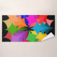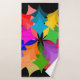 Este conjunto de toalhas tem uma toalha de banho com um design moderno do século médio de uma coroa constituída por estrelas em tons de vermelho, laranja, amarelo, verde, azul e roxo, um toalha de washcloth roxo e uma toalha verde de mão.