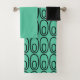 Este conjunto de toalhas tem um pano de lavagem preto, uma toalha verde da mão da casa da moeda, e uma toalha de banho com um design de século médio de um pequeno dentro oval um oval maior num campo de verde da casa da moeda.