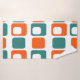 Este conjunto de toalhas tem uma toalha de banho com um design moderno do século médio de retângulos de cor laranja repetidos com retângulos brancos dentro alternando com retângulos de cor, um pano de lavagem laranja e uma toalha de mão lacrimejada.