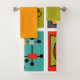 Este conjunto de toalhas tem um pano de lavagem verde, uma toalha de ouro, e uma toalha de banho com um design moderno do século médio de um pedaço de gráficos modernos do século médio em cores retrógradas.