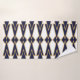 Este conjunto de toalhas tem um pano de lavagem branco, uma toalha de mão dourada, e uma toalha de banho com um design de deco de arte de triângulos e diamantes que se parecem com arcos em azul e ouro.