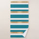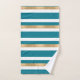 Toalha de banho moderna, branca e dourada, com um padrão riscado horizontal a negrito. Uma placa decorativa de tom lacrimogêneo e dourado, tem um monograma de uma letra branca personalizado. Personalize a carta para atender às suas necessidades. A decoração do banho está disponível.