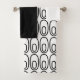 Este conjunto de toalhas tem um pano de lavagem branco, uma toalha de mão preta e uma toalha de banho com um design moderno do século médio de um pequeno dentro oval de maior dimensão num campo de cor branca.