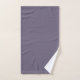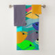 Este conjunto de toalhas tem um pano de lavagem de ouro, uma toalha de mão roxa, e uma toalha de banho com um design de uma escola de peixes nadando no oceano verde, azul, laranja, amarelo, vermelho, rosa e azul-esverdeado.