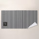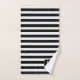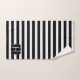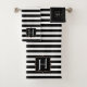 Toalha de banho moderna, preta e branca, com um padrão listrado horizontal no banho e toalhas de mão, com o pano de lavagem a preto sólido. Uma placa decorativa em tons pretos e dourados, tem um monograma de uma letra branca e personalizado. Personalize a carta para atender às suas necessidades. A decoração do banho está disponível.