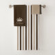 Conjunto de toalhas de banho elegante feito em marrom, bege e branco com listras, na toalha de banho e o pano de rosto é bege com uma faixa marrom. A toalha de mão marrom tem gráficos de uma coroa branca e bege, com texto bege que diz Seu. Personalize o texto para dizer o que você quiser. Ótima ideia de presente para casamentos e novos proprietários. Disponível em um conjunto dela correspondente.
