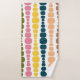 Este conjunto de toalhas tem uma design moderna do século médio de linhas verticais de retângulos arredondados em tamanho crescente e decrescente em cores retrorreflectoras de vermelho, verde, azul, amarelo, laranja e marrom em um campo de branco.
