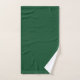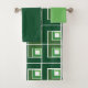 Este conjunto de toalhas tem um pano de lavagem verde-claro, uma toalha verde-escura, e uma toalha de banho com um design geométrico feito de Ls em tons de verde dispostos em diferentes direções se repetindo através do design.