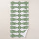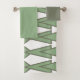 Este conjunto de toalhas tem um pano de lavagem verde-sábio, uma toalha verde-clara, e uma toalha de banho com um design de arte de triângulos e diamantes que se parecem com arcos em verde-claro e verde-sábio.