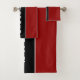 Na moda Red Bath Towel Set com duas listras brancas finas e uma faixa preta vertical larga no centro com nome personalizado nele.