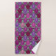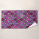 Este conjunto de toalhas tem um pano de lavagem roxo claro, uma toalha roxa mais escura e uma toalha de banho com um design de tulipas de deco de arte de pentágonos e trapezoides em diferentes tons de roxo.