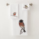 Um conjunto de toalhas com desenhos feitos à mão. Toalha de lavagem: Firecrest (Regulus ignicapilla) Toalha de mão: Pekin Robin (Leiothrix lutea) Grande toalha: Stonechat Europeu (Saxicola Rubicola)